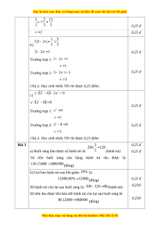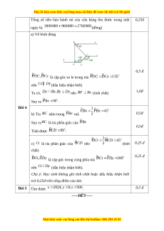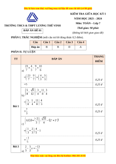 PHẦN I. TRẮC NGHIỆM (mỗi câu trả lời đúng được 0,5 điểm). Câu Câu 1 Câu 2 Câu 3 Câu 4 Đáp án B B D A PHẦN II. TỰ LUẬN THANG TT ĐÁP ÁN ĐIỂM a) 0,25 đ 0,25 đ b) 0,25 đ Bài 1 0,25 đ c) 0,25 đ 0,25 đ Bài 2 a)