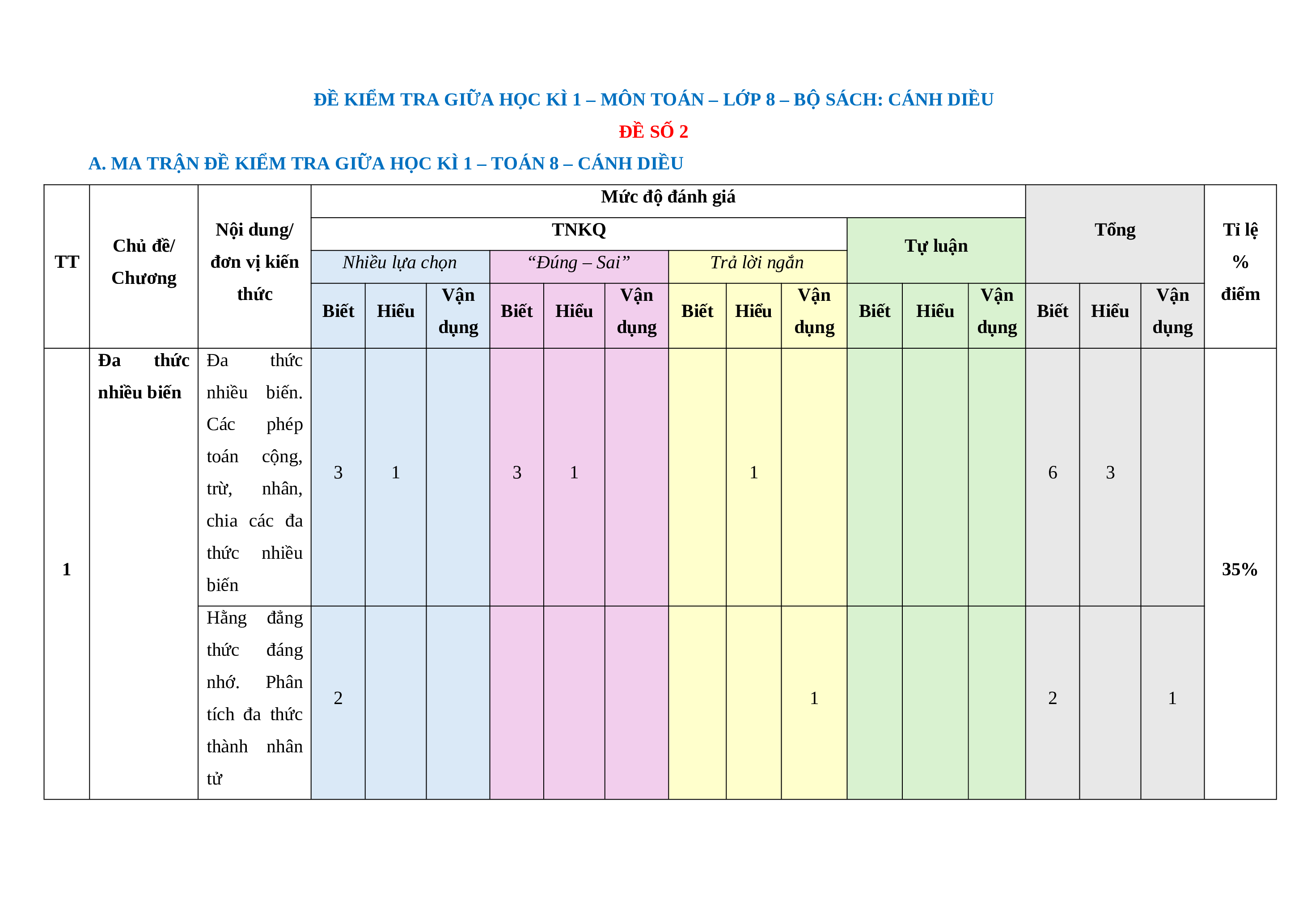 A. MA TRẬN ĐỀ KIỂM TRA GIỮA HỌC KÌ 1 – TOÁN 8 – CÁNH DIỀU Mức độ đánh giá Nội dung/ TNKQ Tổng Tỉ lệ Chủ đề/ Tự luận TT đơn vị kiến Nhiều lựa chọn “Đúng – Sai” Trả lời ngắn % Chương thức Vận Vận Vận Vận Vận điểm Biết Hiểu Biết Hiểu Biết Hiểu Biết Hiểu Biết Hiểu dụng dụng dụng dụng dụng Đa thức Đa thức nhiều biến nhiều biến. Các phép toán cộng, 3 1 3 1 1 6 3 trừ, nhân, chia các đa thức nhiều 1 35% biến Hằng đẳng thức đáng nhớ. Phân 2 1 2 1 tích đa thức thành nhân tử