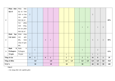 Hình học Hình chóp trực quan tam giác 2 đều, hình 2 3 1 1 1 5 1 2 30% chóp tứ giác đều Định lí Định lí 1 1 2 3 Pythagore. Pythagore 15% Tứ giác Tứ giác 1 1 1 1 Tổng số câu 10 2 6 2 2 2 2 3 16 8 5 29 Tổng số điểm 3,0 2,0 1,0 1,0 1,0 2,0 4,0 3,0 3,0 10,0 Tỉ lệ % 30 20 20 30 40 30 30 100 Lưu ý: