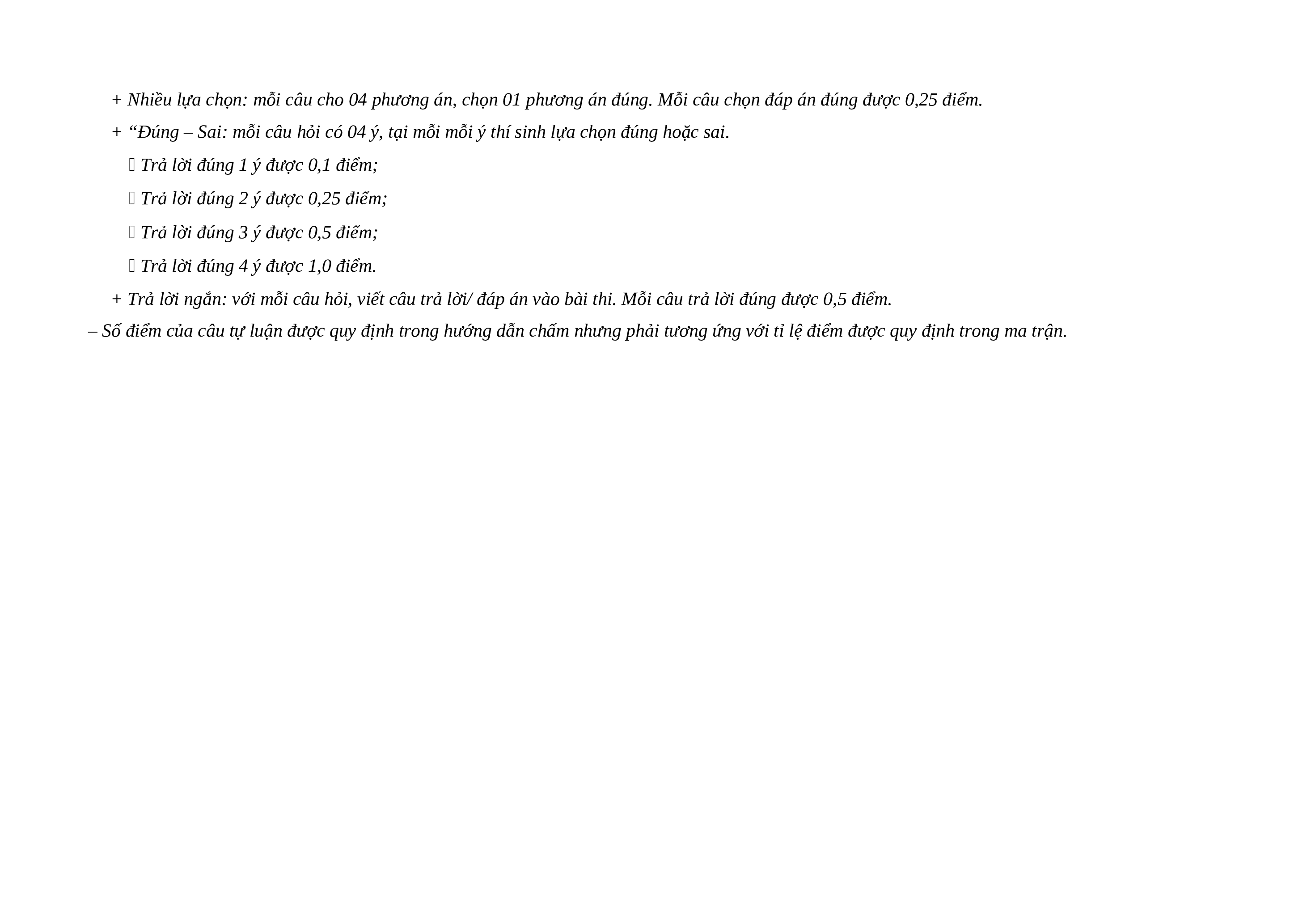 + Nhiều lựa chọn: mỗi câu cho 04 phương án, chọn 01 phương án đúng. Mỗi câu chọn đáp án đúng được 0,25 điểm.
