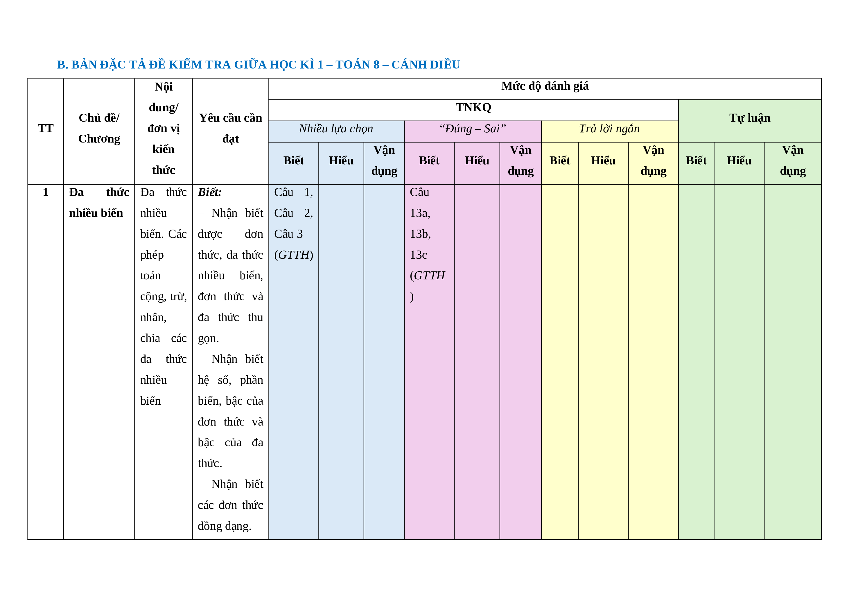 B. BẢN ĐẶC TẢ ĐỀ KIỂM TRA GIỮA HỌC KÌ 1 – TOÁN 8 – CÁNH DIỀU Nội Mức độ đánh giá dung/ TNKQ Chủ đề/ Yêu cầu cần Tự luận TT đơn vị Nhiều lựa chọn “Đúng – Sai” Trả lời ngắn Chương đạt kiến Vận Vận Vận Vận Biết Hiểu Biết Hiểu Biết Hiểu Biết Hiểu thức dụng dụng dụng dụng 1