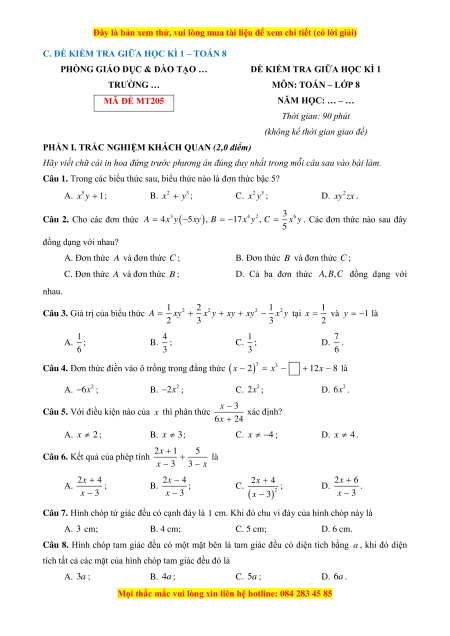 MÔN: TOÁN – LỚP 8 MÃ ĐỀ MT205