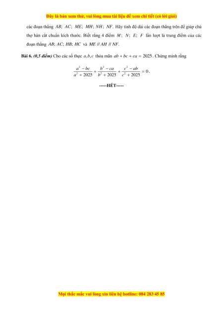 b c thỏa mãn ab bc ca 2025 . Chứng minh rằng 2 2 2 a bc b ca c ab 0 . 2 2 2 a 2025 b 2025 c 2025 -----HẾT-----