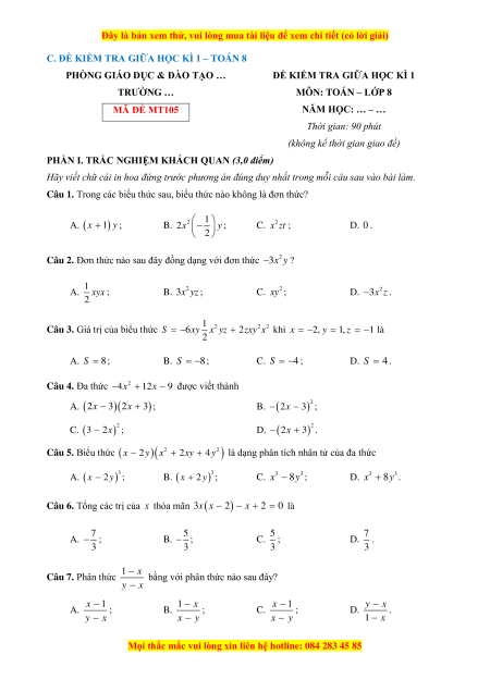 MÔN: TOÁN – LỚP 8 MÃ ĐỀ MT105