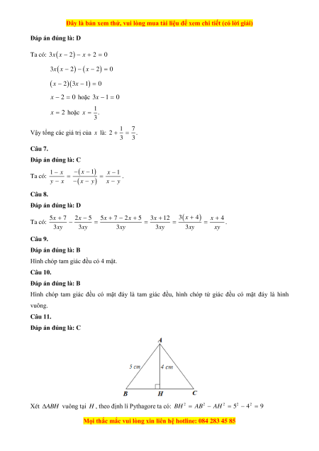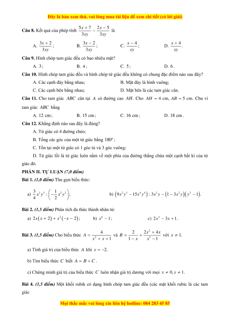 Câu 8. Kết quả của phép tính 5 7 2 5 là 3xy 3xy 3x 2 3x 2 x 4 x 4 A. ; B. ; C. ; D. . 3xy 3xy xy xy