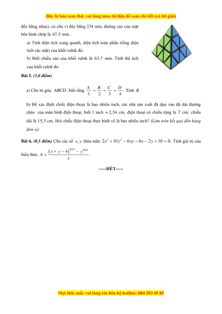 Bài 4. (1,5 điểm) Một khối rubik có dạng hình chóp tam giác đều (các mặt khối rubic là các tam giác