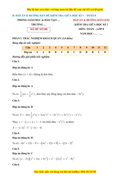 D. ĐÁP ÁN & HƯỚNG DẪN ĐỀ KIỂM TRA GIỮA HỌC KÌ 1 – TOÁN 8