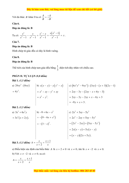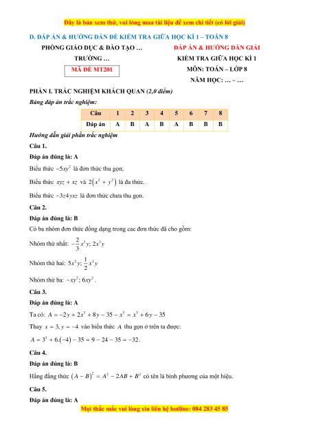 D. ĐÁP ÁN & HƯỚNG DẪN ĐỀ KIỂM TRA GIỮA HỌC KÌ 1 – TOÁN 8