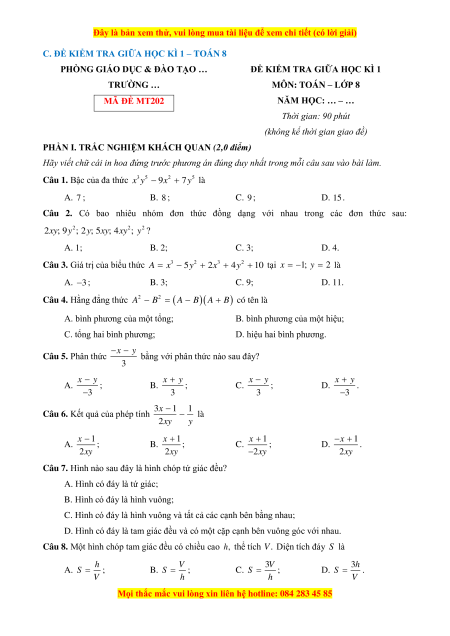 MÔN: TOÁN – LỚP 8 MÃ ĐỀ MT202