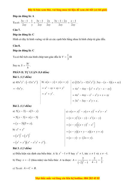Đáp án đúng là: A 3x 1 1 3x 1 2x 3x 1 2x x 1 Ta có: . 2xy y 2xy 2xy 2xy 2xy Câu 7.