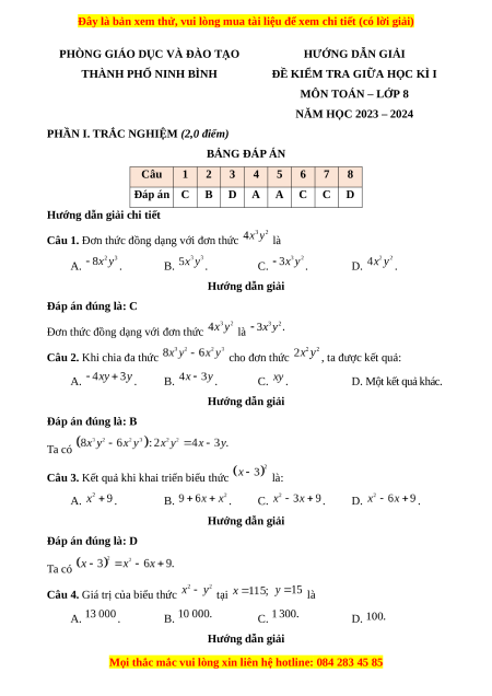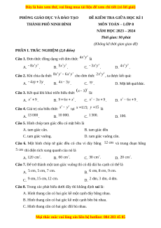 Đề thi giữa kì 1 Toán 8 Cánh diều phòng GD&ĐT Thành phố Ninh Bình