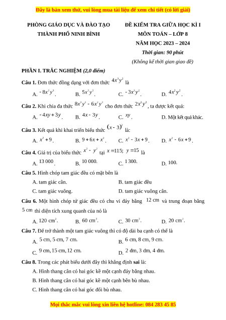 ĐỀ KIỂM TRA GIỮA HỌC KÌ I THÀNH PHỐ NINH BÌNH MÔN TOÁN – LỚP 8