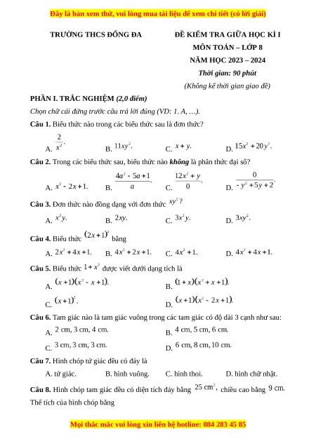 Đề thi giữa kì 1 Toán 8 Cánh diều trường THCS Đống Đa - Hà Nội