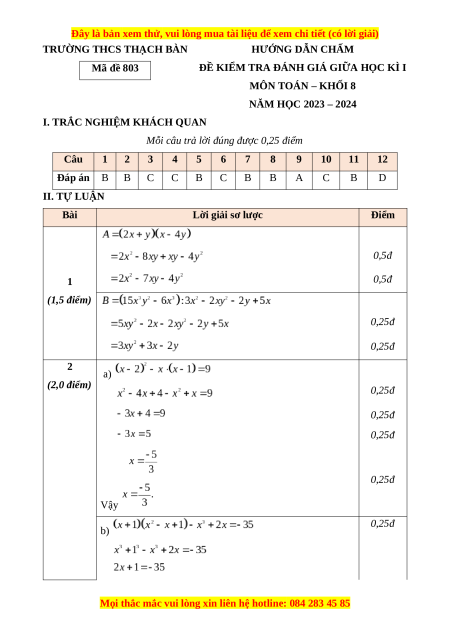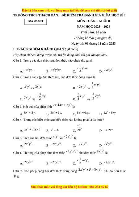 TRƯỜNG THCS THẠCH BÀN ĐỀ KIỂM TRA ĐÁNH GIÁ GIỮA HỌC KÌ I Mã đề 803 MÔN TOÁN – KHỐI 8