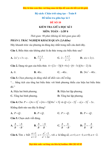 Đề thi giữa kì 1 Toán 8 Chân trời sáng tạo (đề 10)