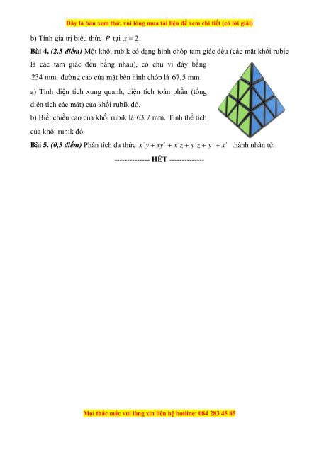 Bài 4. (2,5 điểm) Một khối rubik có dạng hình chóp tam giác đều (các mặt khối rubic