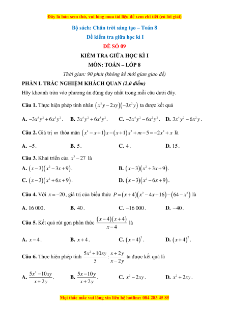 Đề thi giữa kì 1 Toán 8 Chân trời sáng tạo (đề 9)
