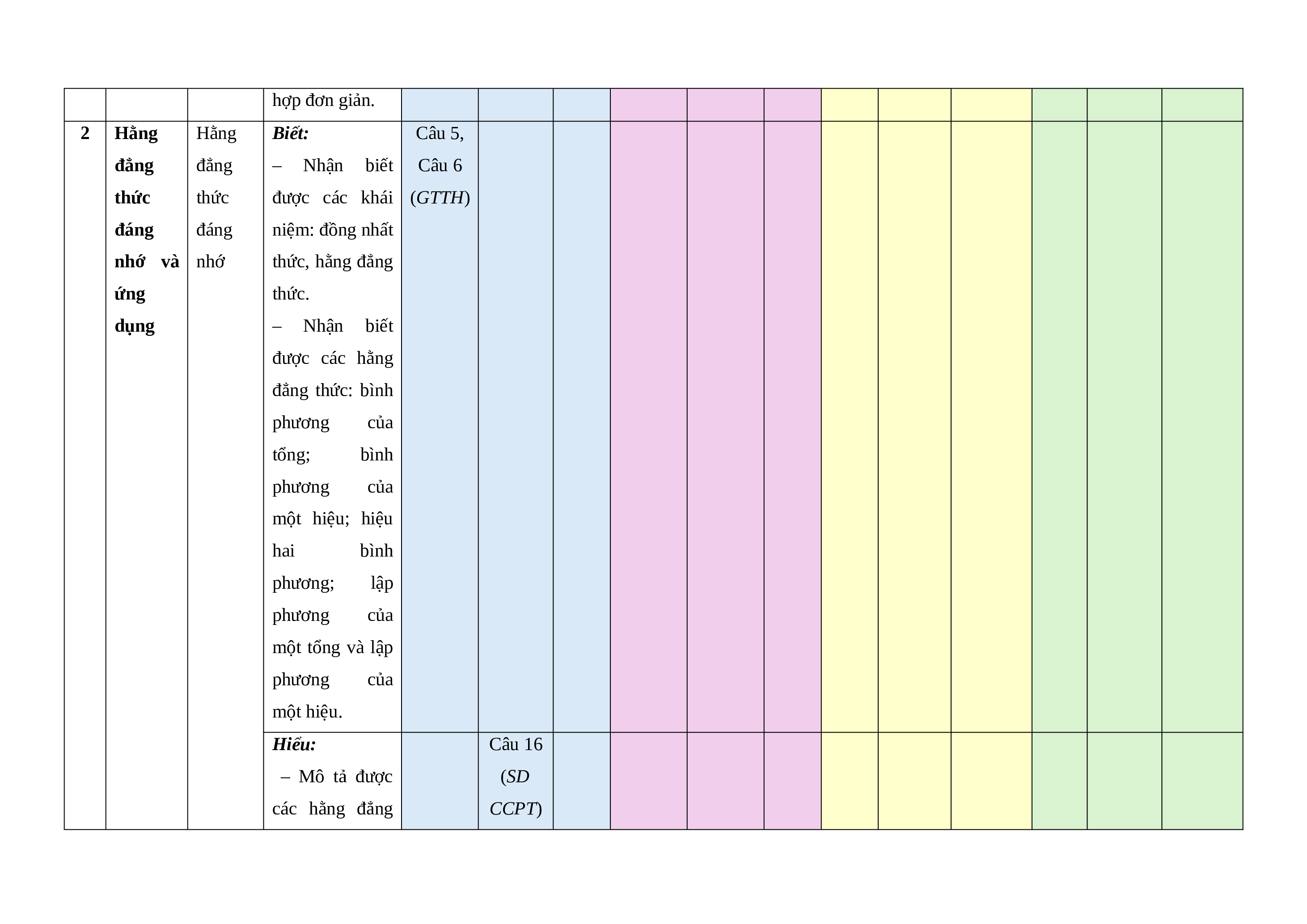 đa thức nhiều (GTTH) 13c Các biến, đơn thức (GTTH) phép và đa thức thu toán gọn. cộng, – Nhận biết hệ trừ, số, phần biến, nhân, bậc của đơn chia thức và bậc của các đa đa thức. thức – Nhận biết các nhiều đơn thức đồng biến dạng. Hiểu: Câu 4 Câu Câu 15 – Tính được giá (SD 13d (SD trị của đa thức CCPT) (SD CCPT) khi biết giá trị CCPT) của các biến. – Thực hiện được việc thu gọn đơn thức, đa thức. – Thực hiện được các phép tính: phép cộng, phép trừ, phép nhân các đa thức nhiều biến trong những trường hợp đơn giản. – Thực hiện được phép chia hết một đa thức cho một đơn thức trong những trường