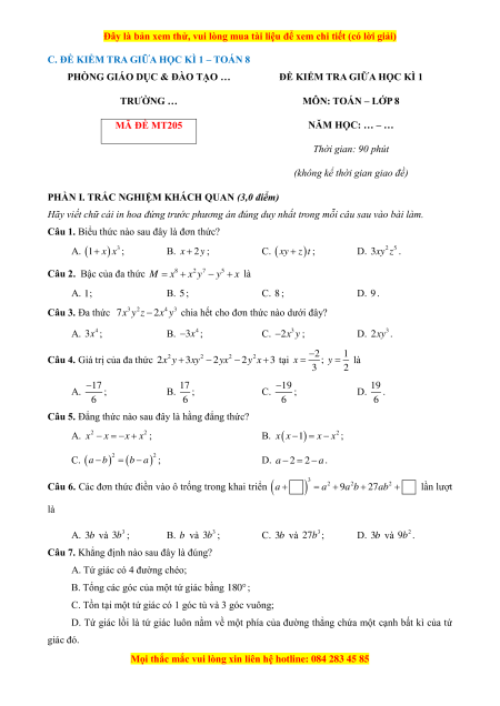 MÔN: TOÁN – LỚP 8 MÃ ĐỀ MT205
