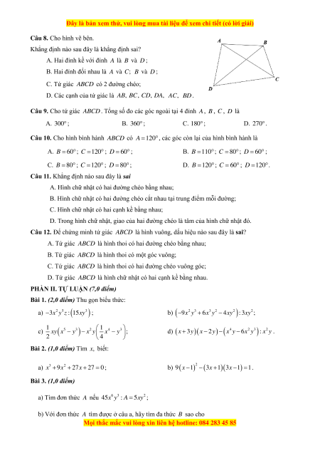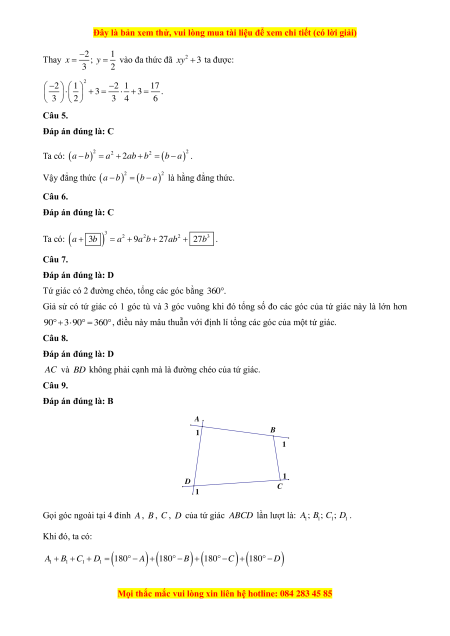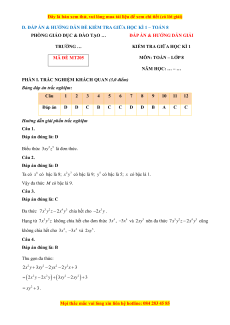 D. ĐÁP ÁN & HƯỚNG DẪN ĐỀ KIỂM TRA GIỮA HỌC KÌ 1 – TOÁN 8