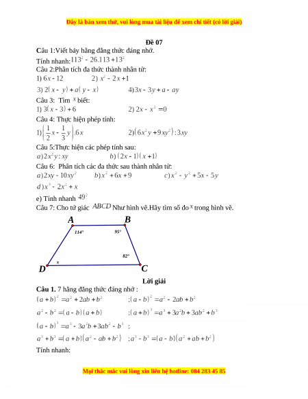 Câu 6: Phân tích các đa thức sau thành nhân tử: e) Tính nhanh Câu 7: Cho tứ giác