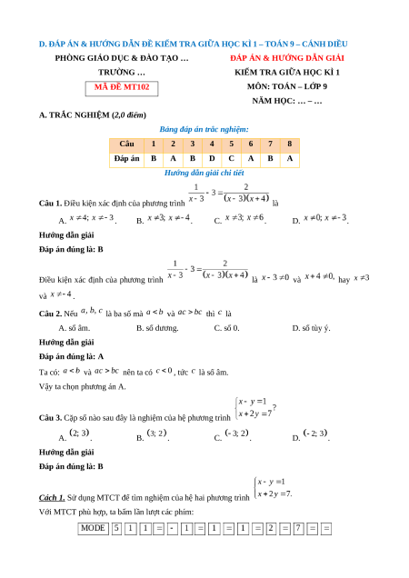ĐỀ KIỂM TRA GIỮA HỌC KÌ 1 – MÔN TOÁN – LỚP 9 – BỘ SÁCH CÁNH DIỀU ĐỀ SỐ 02