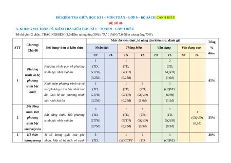 A. KHUNG MA TRẬN ĐỀ KIỂM TRA GIỮA HỌC KÌ 1 – TOÁN 9 – CÁNH DIỀU