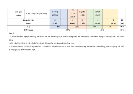Tổng: Số câu 8 4 3 4 1 20 Điểm (2,0đ) (1,0đ) (2,5đ) (4,0đ) (0,5đ) (10đ) Tỉ lệ 20% 35% 40% 5% 100% Tỉ lệ chung 55% 45% 100% Lưu ý: