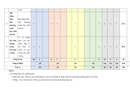 tam giác cạnh và góc vuông trong tam giác vuông Tổng số câu 10 2 6 2 4 4 16 8 4 28 Tổng số điểm 3,0 2,0 2,0 3,0 4,0 3,0 3,0 10,0 Tỉ lệ % 30 20 20 30 40 30 30 100 Lưu ý: