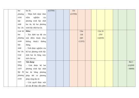 Số câu hỏi ở các mức độ đánh giá dung/ TNKQ Chủ đề/ Tự luận TT đơn vị Yêu cầu cần đạt Nhiều lựa chọn “Đúng – Sai” Trả lời ngắn Chương kiến Vận Vận Vận Vận Biết Hiểu Biết Hiểu Biết Hiểu Biết Hiểu thức dụng dụng dụng dụng 1 Phương Phươn Biết: Câu 1