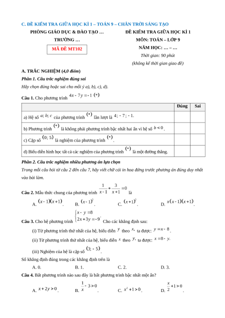 C. ĐỀ KIỂM TRA GIỮA HỌC KÌ 1 – TOÁN 9 – CHÂN TRỜI SÁNG TẠO