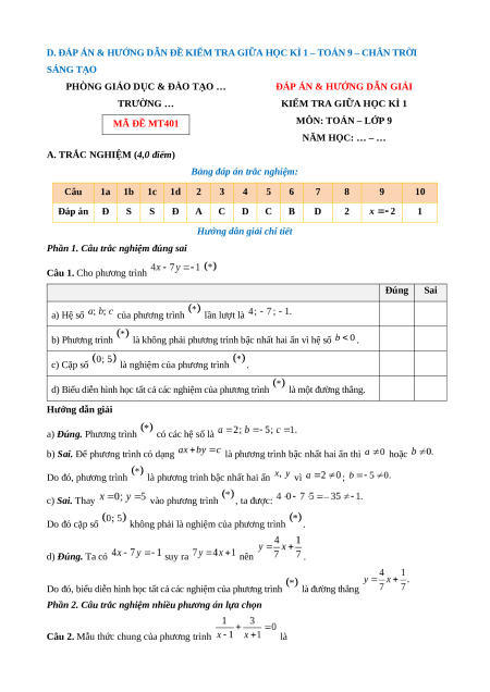 D. ĐÁP ÁN & HƯỚNG DẪN ĐỀ KIỂM TRA GIỮA HỌC KÌ 1 – TOÁN 9 – CHÂN TRỜI SÁNG TẠO
