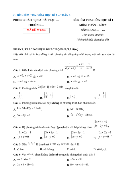ĐỀ KIỂM TRA GIỮA HỌC KÌ 1 TRƯỜNG … MÔN: TOÁN – LỚP 9 MÃ ĐỀ MT204 NĂM HỌC: … – … Thời gian: 90 phút