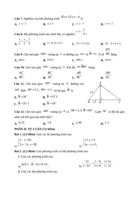 Câu 8. Bất phương trình nào dưới đây có nghiệm ? A. B. C. D. Câu 9. Cho tam giác