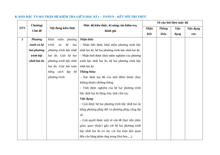 B. BẢN ĐẶC TẢ MA TRẬN ĐỀ KIỂM TRA GIỮA HỌC KÌ 1 – TOÁN 9 – KẾT NỐI TRI THỨC