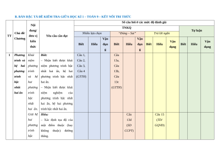 B. BẢN ĐẶC TẢ ĐỀ KIỂM TRA GIỮA HỌC KÌ 1 – TOÁN 9 – KẾT NỐI TRI THỨC