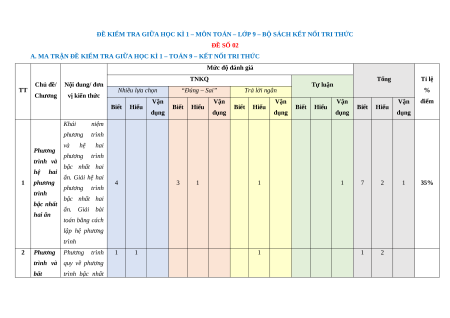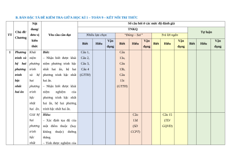 B. BẢN ĐẶC TẢ ĐỀ KIỂM TRA GIỮA HỌC KÌ 1 – TOÁN 9 – KẾT NỐI TRI THỨC Nội