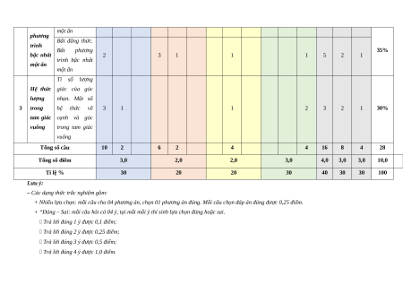 tam giác cạnh và góc vuông trong tam giác vuông Tổng số câu 10 2 6 2 4 4 16 8 4 28 Tổng số điểm 3,0 2,0 2,0 3,0 4,0 3,0 3,0 10,0 Tỉ lệ % 30 20 20 30 40 30 30 100 Lưu ý: