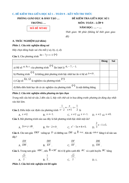 ĐỀ KIỂM TRA GIỮA HỌC KÌ 1 TRƯỜNG … MÔN: TOÁN – LỚP 9 MÃ ĐỀ MT402 NĂM HỌC: … – …