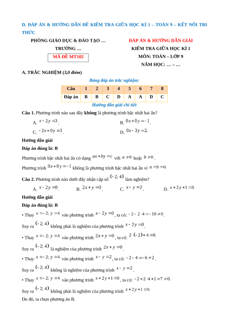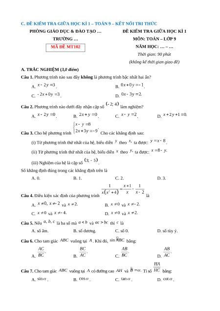 ĐỀ KIỂM TRA GIỮA HỌC KÌ 1 – MÔN TOÁN – LỚP 9 – BỘ SÁCH KẾT NỐI TRI THỨC ĐỀ SỐ 02