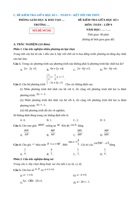 A. KHUNG MA TRẬN ĐỀ KIỂM TRA GIỮA HỌC KÌ 1 – TOÁN 9 – KẾT NỐI TRI THỨC