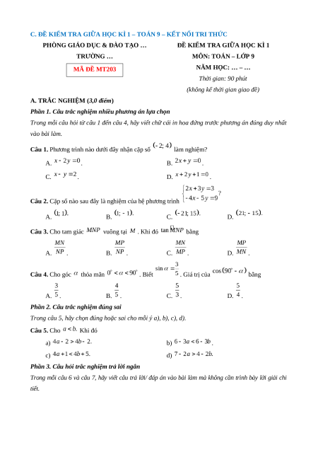 ĐỀ KIỂM TRA GIỮA HỌC KÌ 1 – MÔN TOÁN – LỚP 9 – BỘ SÁCH KẾT NỐI TRI THỨC ĐỀ SỐ 05