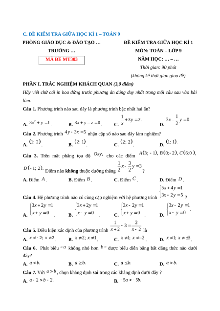 MÔN: TOÁN – LỚP 9 MÃ ĐỀ MT303 NĂM HỌC: … – … Thời gian: 90 phút