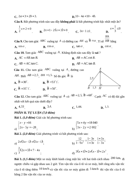 Câu 8. Bất phương trình nào sau đây không phải là bất phương trình bậc nhất một ẩn? A. . B. . C. . D. . Câu 9. Cho tam giác