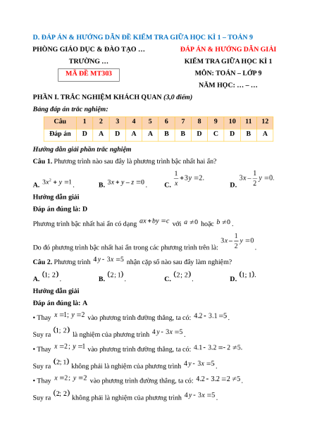 D. ĐÁP ÁN & HƯỚNG DẪN ĐỀ KIỂM TRA GIỮA HỌC KÌ 1 – TOÁN 9