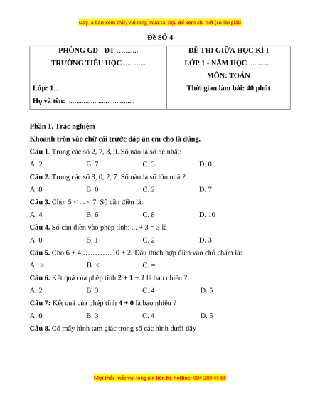 Câu 4. Số cần điền vào phép tính: ... + 3 = 3 là A. 0 B. 1 C. 2 D. 3