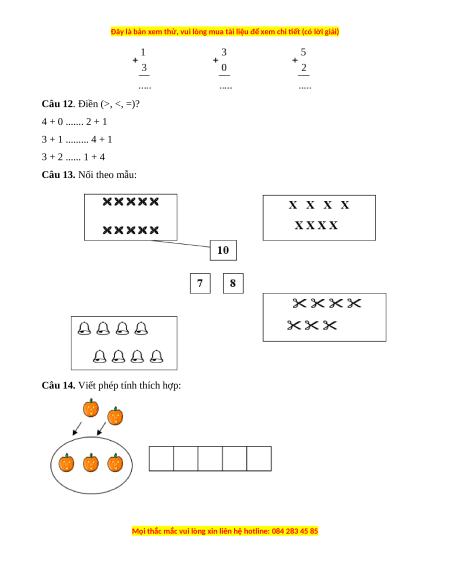 Câu 12. Điền (>, <, =)? 4 + 0 ....... 2 + 1 3 + 1 ......... 4 + 1 3 + 2 ...... 1 + 4