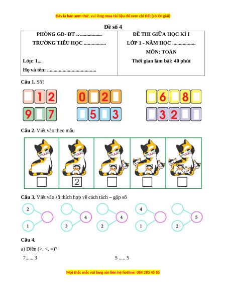 LỚP 1 - NĂM HỌC .................. MÔN: TOÁN Lớp: 1...