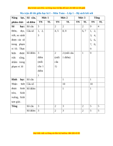hiện được Số điểm 3 2 2 (mỗi câu 1 9 việc cộng, điểm (mỗi 1 điểm) nhẩm trong (mỗi câu phạm vi 10 câu 1 1) điểm ) Hình học: Số câu 1 1 Nhận biết Câu số 10 10 được hình Số điểm 1 1 tròn, hình vuông, hình tam giác. Tổng Số câu 3 2 3 2 5 5 Số điểm 3 2 3 2 5 5