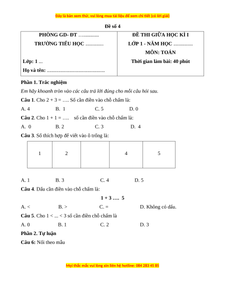 Câu 5. Cho 1 < ... < 3 số cần điền chỗ chấm là A. 0 B. 1 C. 2 D. 3 Phần 2. Tự luận